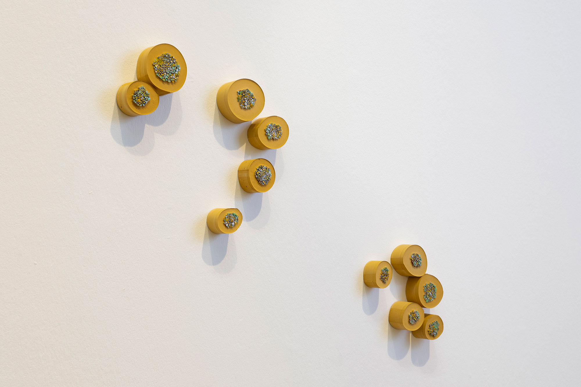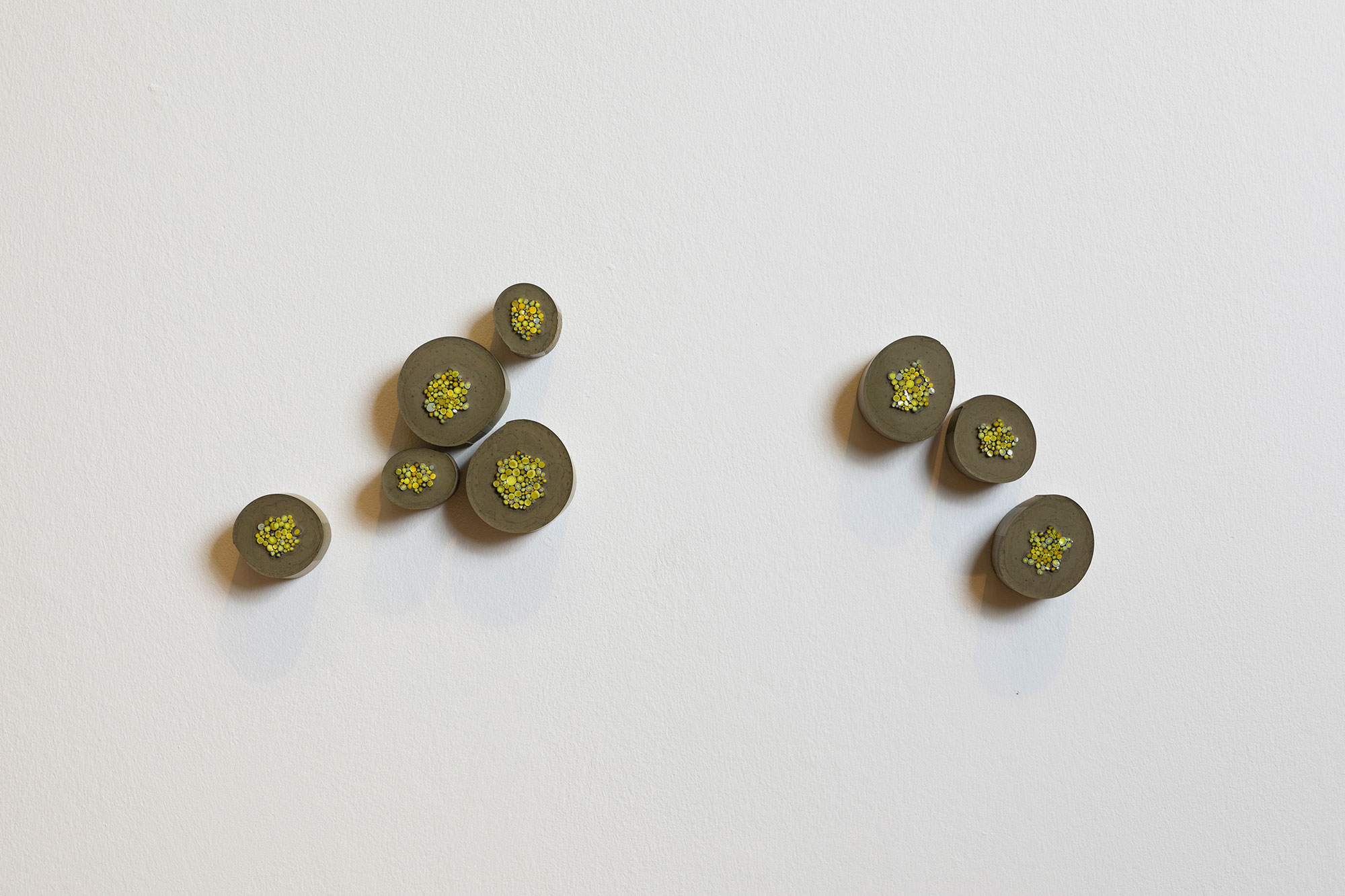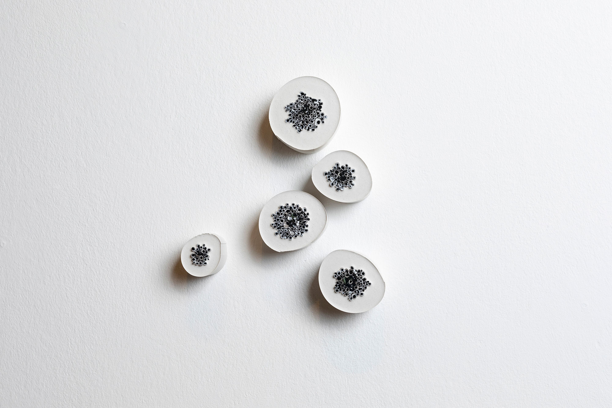 Miniature, organic shaped, wall sculptures appear to cluster and disperse, suggestive of lichens and cellular worlds meticulously observed.